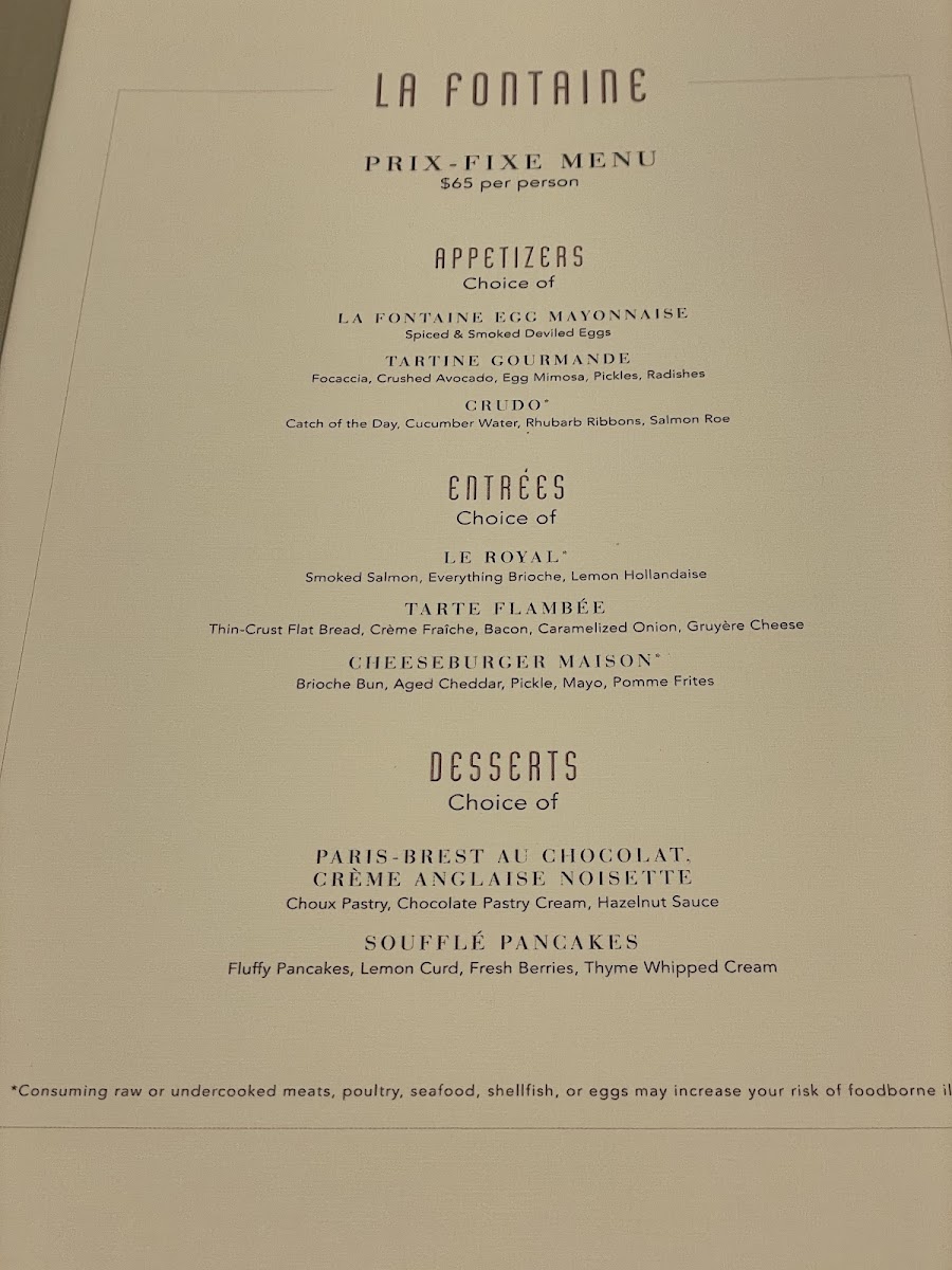 Welcome to La Fontaine, a culinary gem nestled on the bustling Las Vegas Boulevard. This elegant establishment promises a delightful menu that harmonizes traditional French flavors with modern flair. Begin your culinary journey with their salads, featuring the classic Lyonnaise and Endives Au Roquefort, each priced at US$24.00. For breakfast enthusiasts, La Fontaine offers enticing options like Souffle Pancakes and Pain Perdu, showcasing a range of textures and flavors, all under US$36.00.